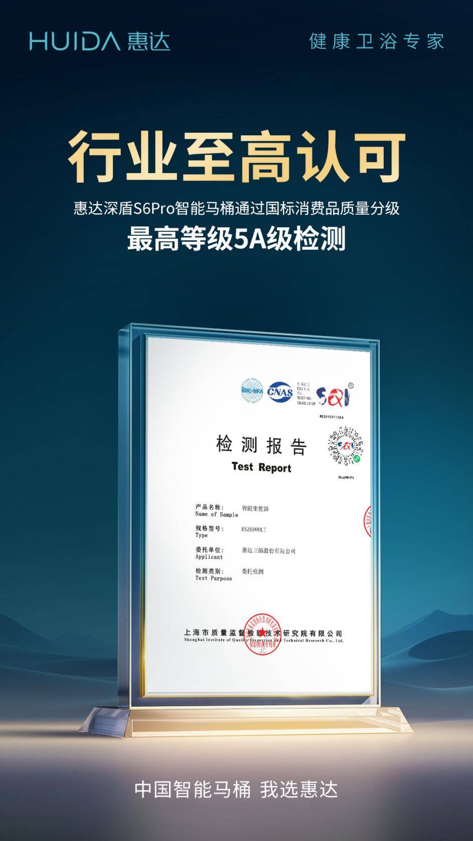 近日,惠达卫浴旗下智能马桶产品——HSZ6000LT(深盾S6Pro),经国家权威检测机构全面检测,其关键性能指标均达到国家质量分级的最高等级——5A级(AAAAA级)要求,标志着该产品在综合品质上已处于行业领先水平。